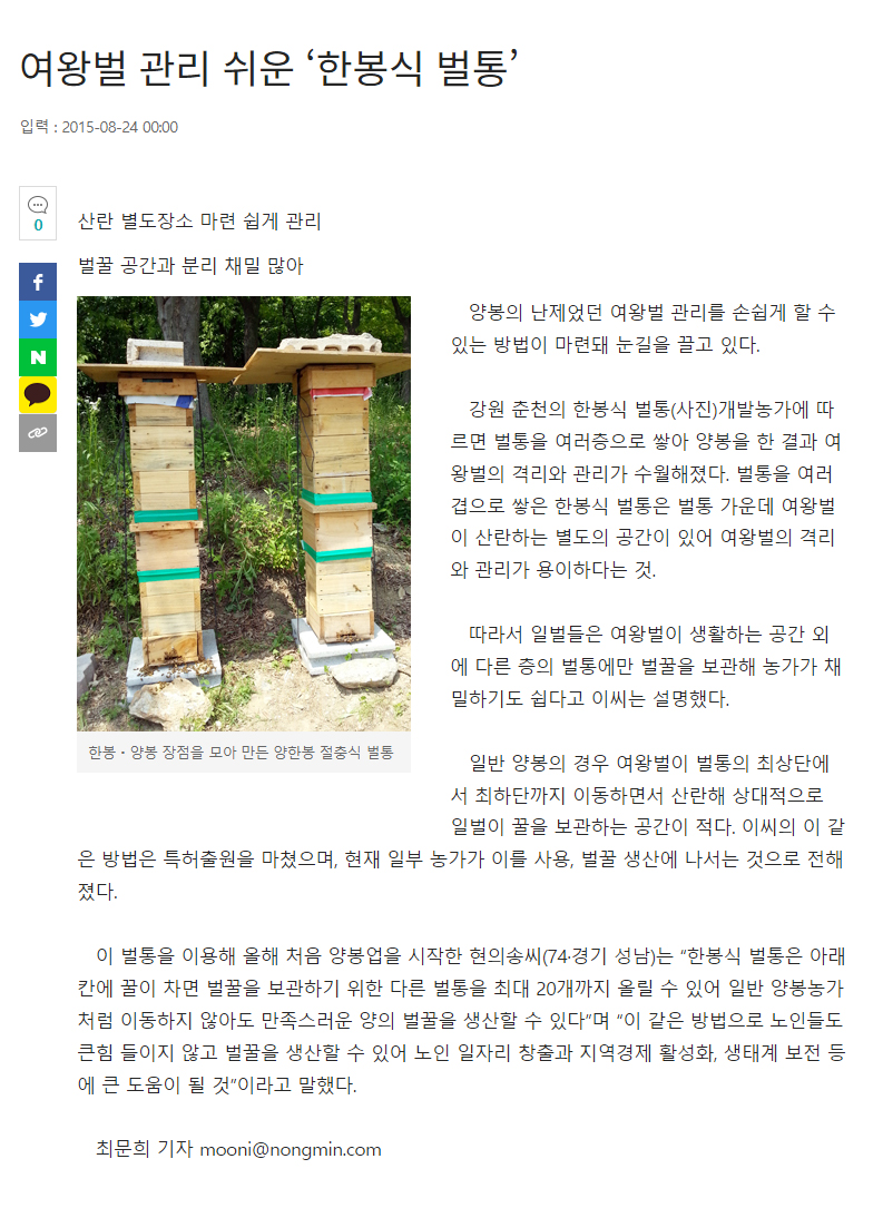 벌과 자연은 벌집꿀 채집을 위한 특허기술의 이용 및 보급을 통해